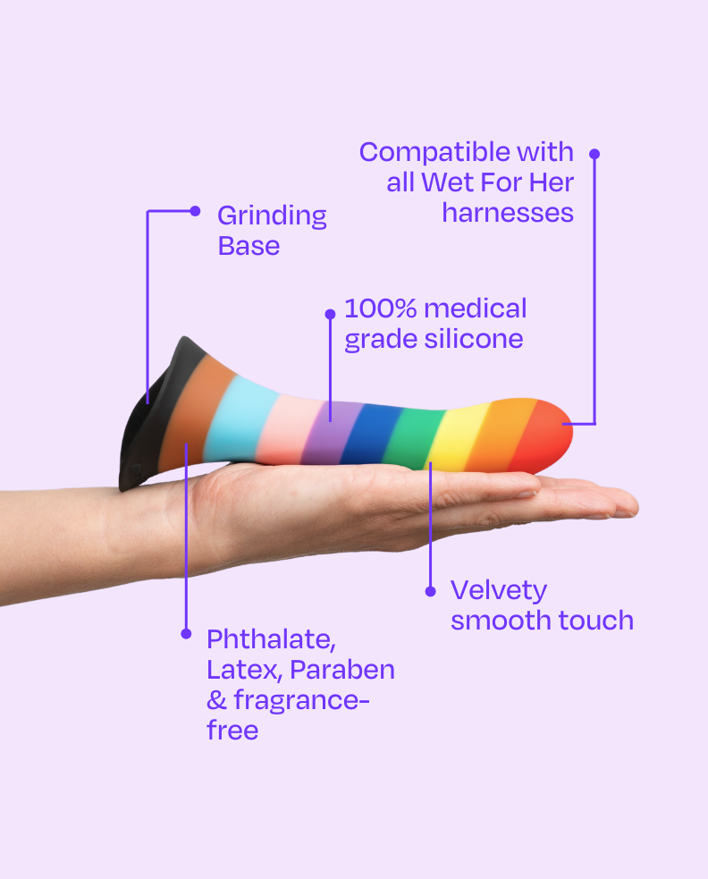Ontworpen door lesbiennes voor de LGBTQ+ gemeenschap, is de Pride Fusion strap-on dildo exclusief verkrijgbaar bij Wet For Her en viert liefde, identiteit en plezier. Met zijn gedurfde regenboogstrepen is deze gelimiteerde dildo een levendige herinnering om je ware zelf te zijn en dat met elkaar te delen.