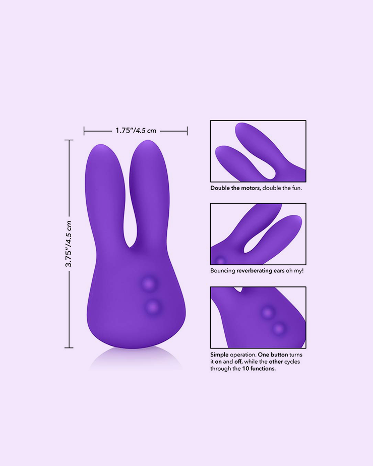 The uniquely contoured personal massager boasts 10 intensely powerful vibrations, pulsation and escalation functions for ultimate erotic satisfaction. The curvy massager has bouncing reverberating ears for intensified precision stimulation of all your super sensitive sweet spots.