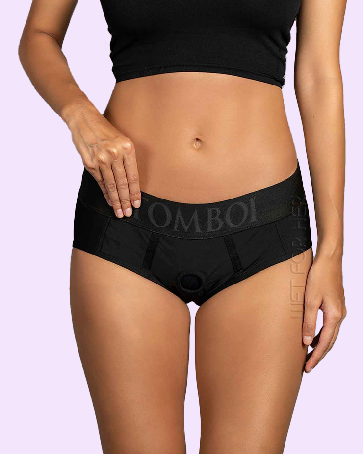 The Tomboi boxer brief harness is one of our top-rated Spareparts products and is designed to be enjoyed by the entire LGBTQIA+ community. Simple to slip on and incredibly comfortable to wear, the Tomboi strap-on harness can be used for both packing and penetrative play, or both!Simply select the Wet For Her dildo or FTM packer you would like to use and then attach it to the elastic o ring on the front of your underwear.